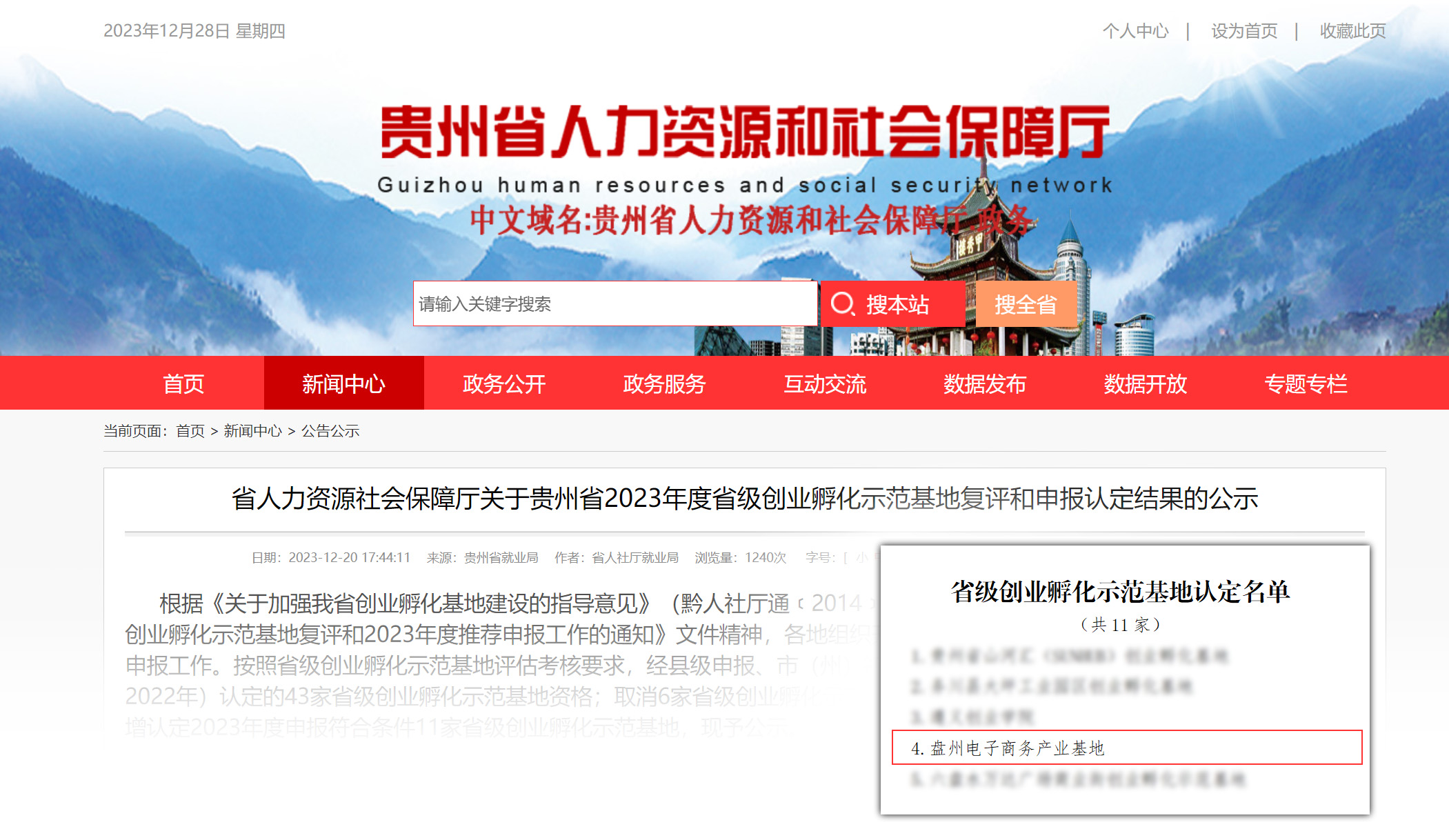 根據《關于加強我省創業孵化基地建設的指導意見》(黔人社廳通﹝2014﹞250號)和《省人力資源社會保障廳關于開展省級創業孵化示范基地復評和2023年度推薦申報工作的通知》文件有關規定,經基地申報,縣級申報、市(州)初審、省級評估等程序,天度集團盤州蔚嵐電子商務有限公司建設運營的“盤州電子商務產業基地”獲得貴州省人力資源和社會保障廳“省級創業孵化示范基地”認定。
